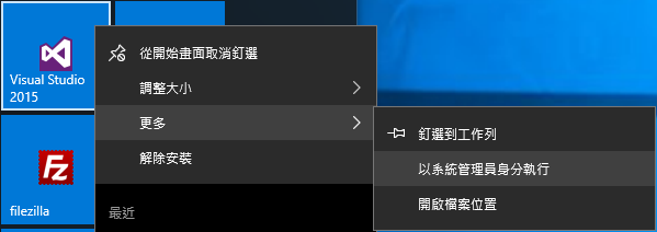 確認 Visual Studio 是否「以系統管理員身分執行」:
